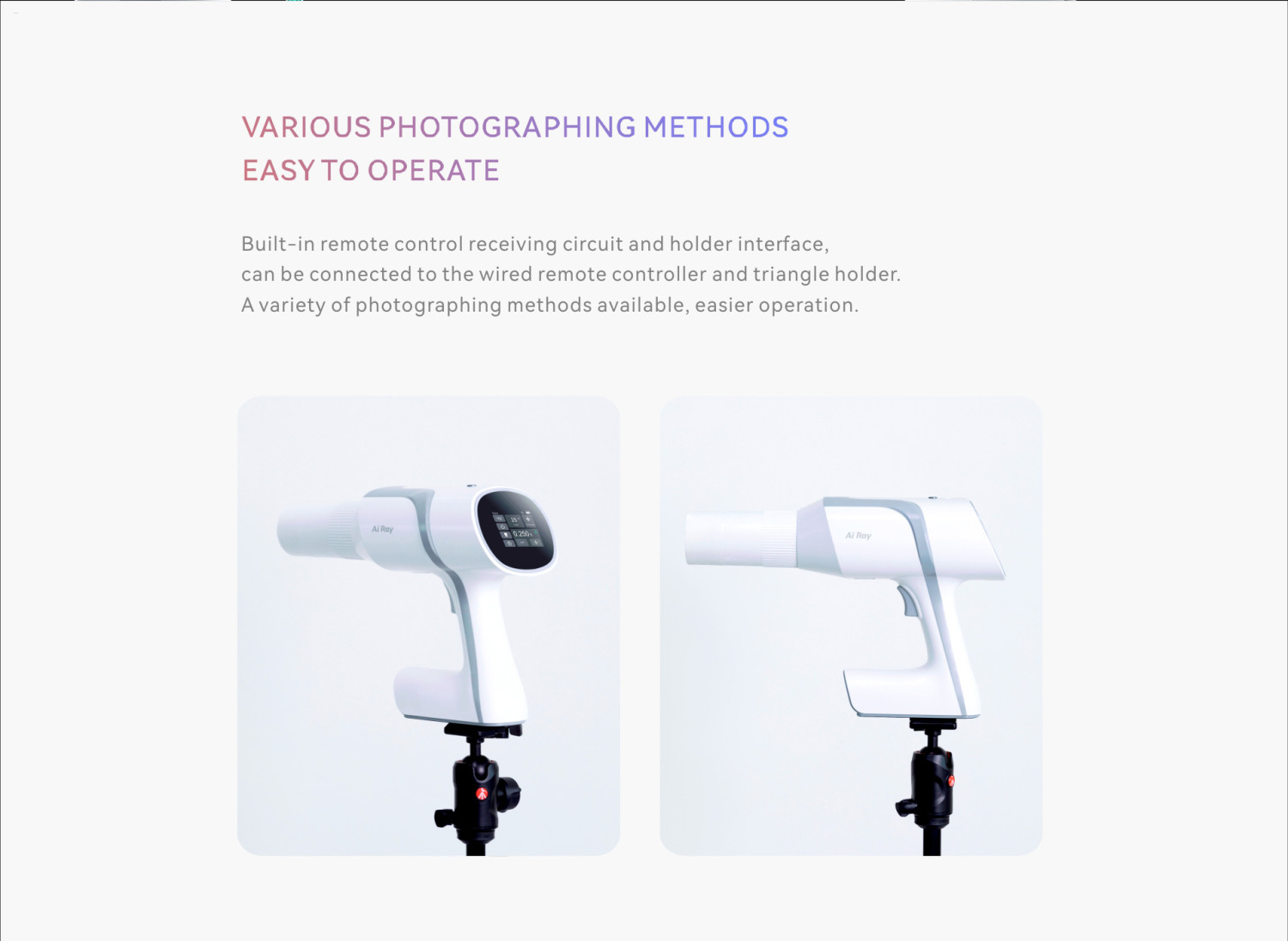 Various Photographing Methods, Easy to Operate: Adapt to any clinical scenario. With a built-in remote control receiving circuit and holder interface, the Ai Ray can be connected to a wired remote controller or a versatile triangle holder, offering a variety of photographing methods for easier operation and improved workflow.