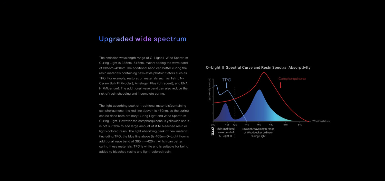 Dual-Wavelength Spectrum: The light emits a broad-spectrum output, covering wavelengths from to . This ensures effective curing of virtually all photoinitiators, including TPO and Lucirin TPO, essential for modern composites.