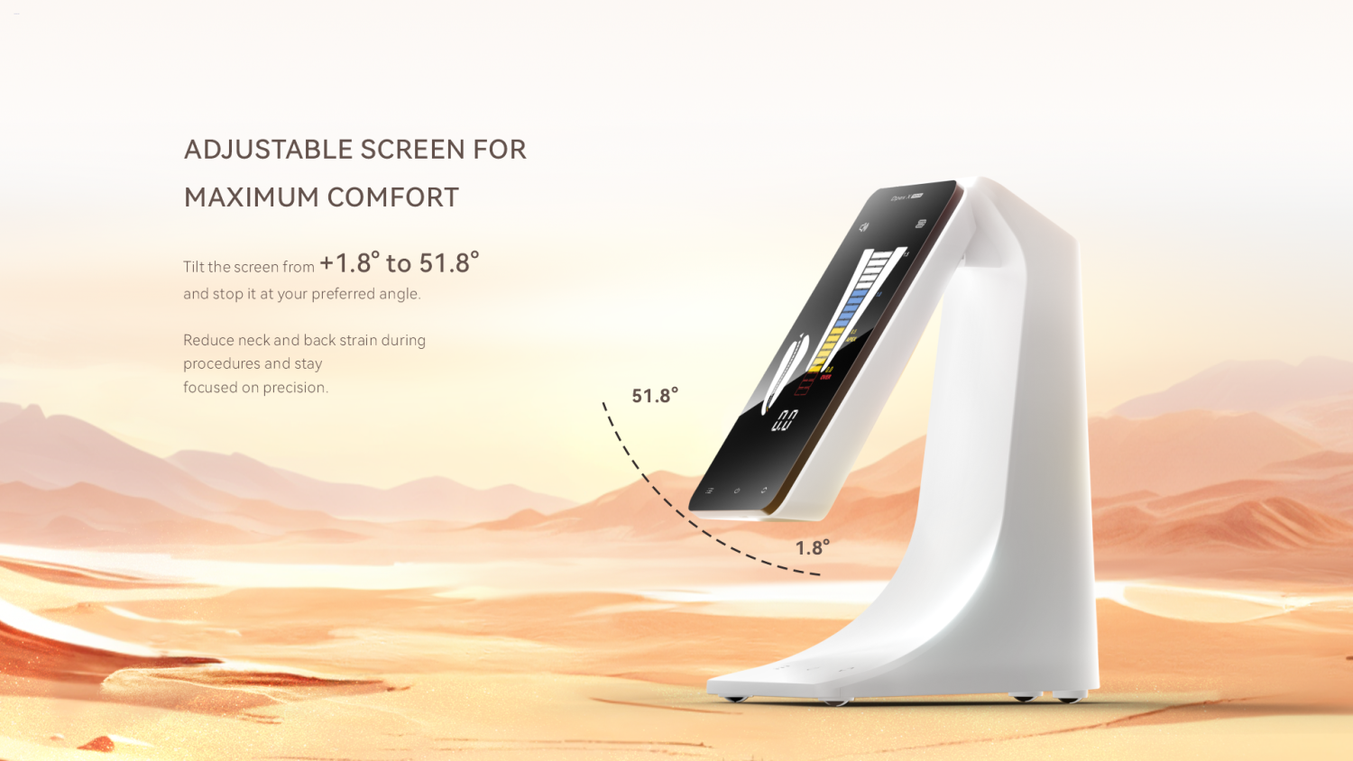 "Black Gold" Aesthetic: The sleek, modern design with its dark body and rosy gold base is a striking addition to any operatory. The optimized LCD display provides brighter colors, evenly distributed light, and zero glare for fatigue-free viewing.